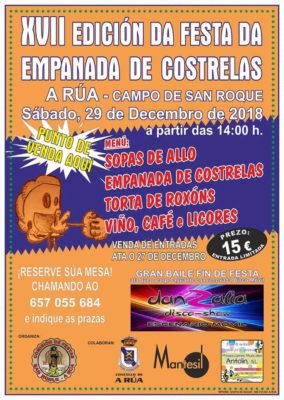 Esta última fiesta gastronómica del año 2018 en la comarca de Valdeorras tuvo un menú compuesto por sopas de ajo, la famosa ‘empanada de costrelas’, torta de roxós y todo ello con vino, café y licores. Además la fiesta se prolongó con gran baile a cargo de Danzalia.