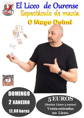 O Liceo de Ourense convídavos a unha sesión matinal de maxia este vindeiro domingo, 2 de xaneiro. Chega, dende Ribadavia,e da man de Hermanager Producións, O Mago Deimi cun espectáculo dunha hora para sorprender a toda a familia.