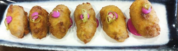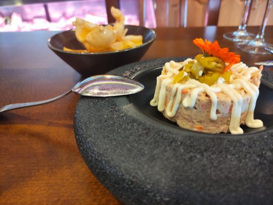 Empezamos con unos entrantes. Si algo tienen es toque personal. Su filosofía, en los platos. Tanto la ensaladilla, como las patatas bravas o las croquetas (que según nos cuentan también irán variando el ingrediente principal) de cocido no dejan indiferente. Buena presentación y sabor, sobretodo sabor. Detalles como la mayonesa de remolacha, no sólo “decoran” potencian y conjugan el sabor de las croquetas y le dan equilibrio.