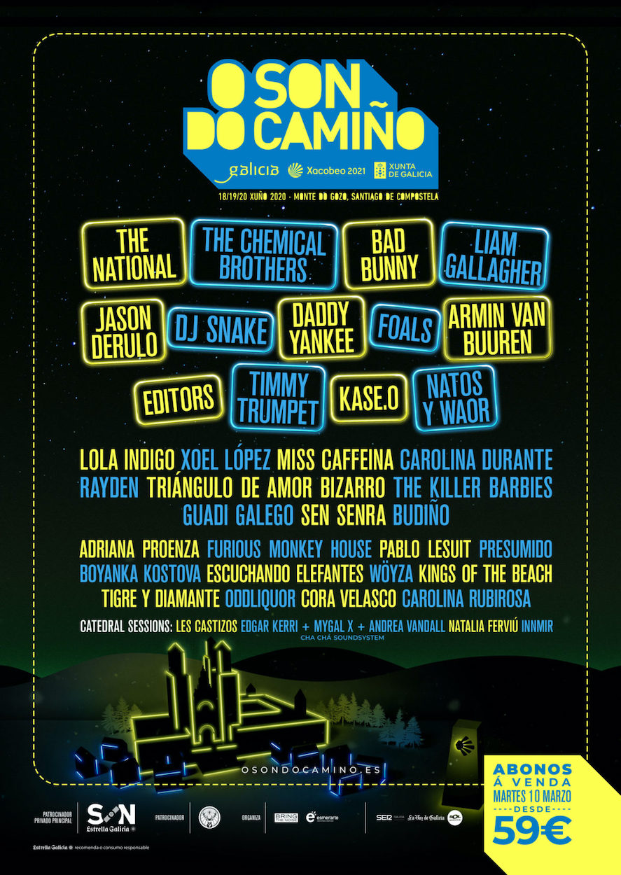 Tras el éxito conseguido en sus primeras ediciones, con cerca de 97.000 asistentes y más de una veintena de reconocimientos, O Son do Camiño estará protagonizado este año por nombres como The National, The Chemical Brothers, Bad Bunny, Liam Gallagher, Jason Derulo, DJ Snake, Foals, Daddy Yankee, Armin Van Buuren, Editors, Timmy Trumpet, Kase.O y Natos y Waor, entre otros. Así lo dieron a conocer el titular de Cultura del Gobierno gallego y las empresas organizadoras del festival, representadas por Carlos Rodríguez, de Esmerarte Industrias Creativas, e Iván Méndez, de Bring The Noise, en una rueda de prensa en la Cidade da Cultura que contó con las actuaciones de Xoel López y de Budiño. Igualmente participó Víctor Mantiñán, responsable de patrocinios musicales de Estrella Galicia.