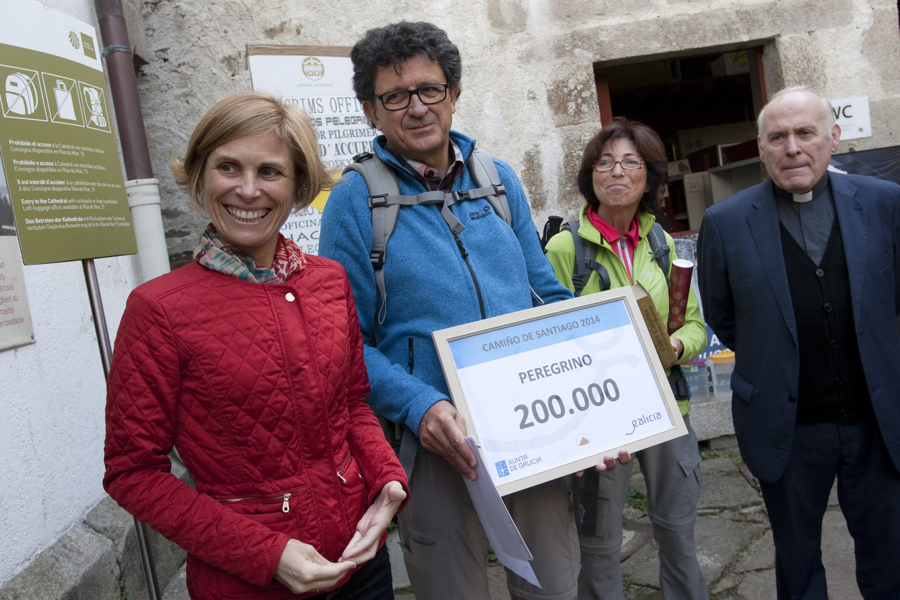 A directora de Turismo de Galicia, Nava Castro Domnguez, xunto co den da Catedral de Santiago, Segundo Leonardo Prez Lpez, recibie o peregrino nmero 200.000 deste ano.