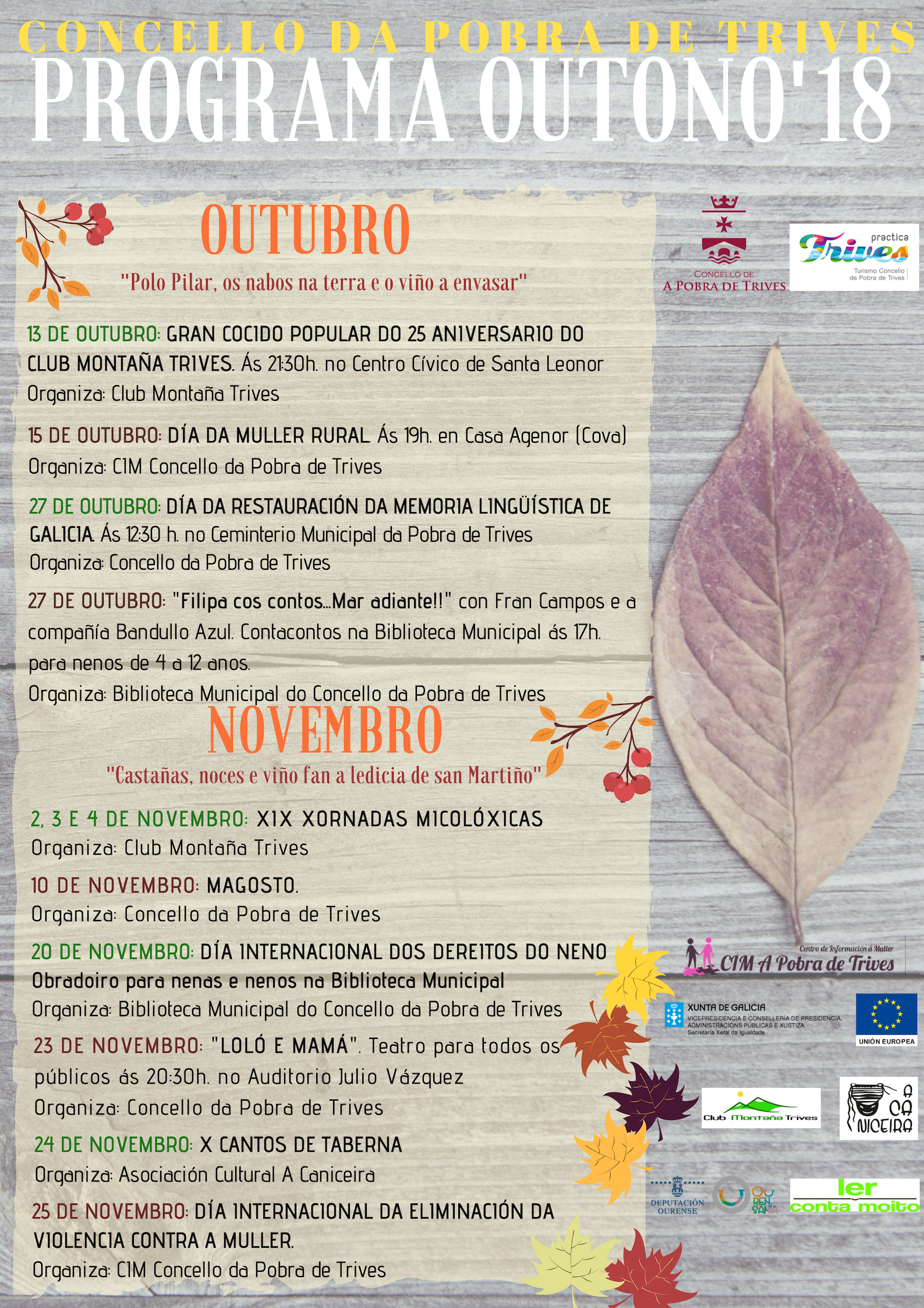 Día de la Mujer Rural, Día de la Restauración de la Memoria Lingüística de Galicia, Día Internacional de los Derechos del Niño o Día Internacional de la Eliminación de la Violencia Contra la Mujer son fechas que se conmemorarán desde el Ayuntamiento de A Pobra de Trives resaltando la importancia que todas y cada una de ellas tienen en nuestra sociedad. Teatros para grandes y pequeños, o el magosto con un programa de actividades y concursos, talleres para el público menudo o paseos en la naturaleza, también se disfrutarán en este otoño, junto con atractivas y divertidas actividades que vienen de la mano de distintas asociación como son las Jornadas Micológicas del Club de Montaña Trives, o los Cantos de Taberna de la Asociación Cultural A Caniceira.