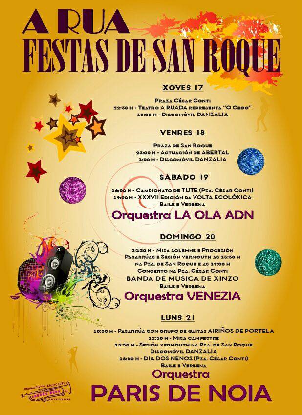 El domingo 20 de agosto arrancará con pasacalles a cargo de la Agrupación Musical Da Limia. A las 12,30 horas habrá sesión vermú con la citada agrupación. Ya por la tarde, a las 19,00 horas, será el turno de la Orquesta Venezia para brindar la sesión de baile en el Campo de San Roque.
