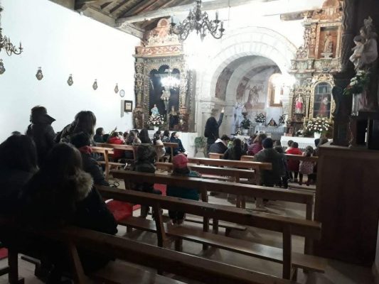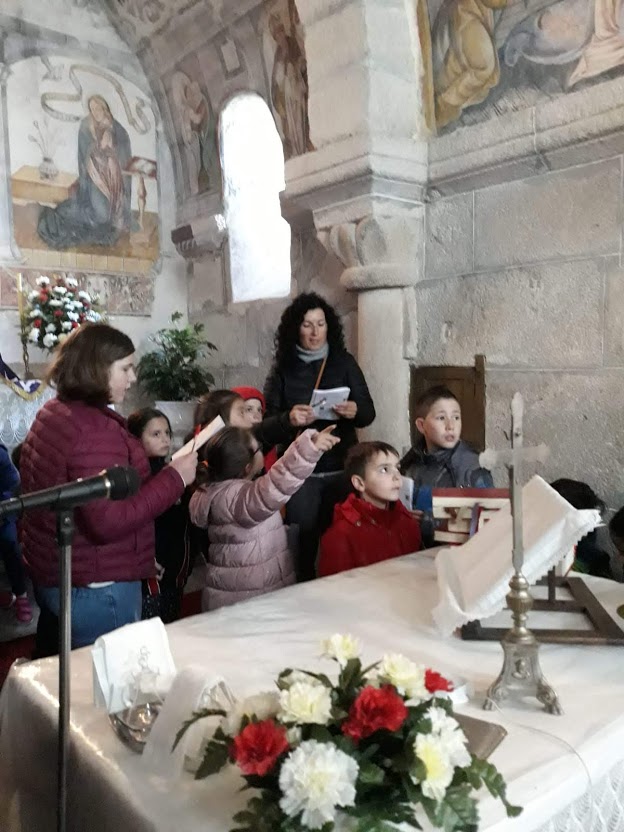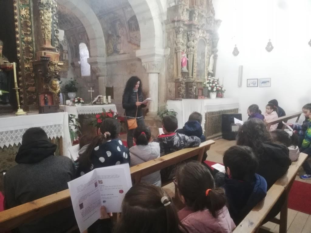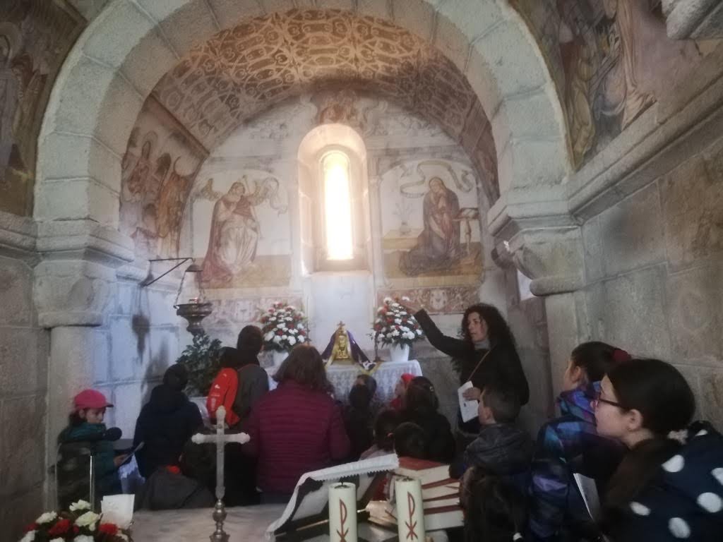 En la parte exterior se fijaron en sus sus formas y en el material con el que está construida y entraron para conocerla también por dentro: buscaron plantas y flores en los capiteles, un dibujo ajedrezado en el arco principal y se fijaron en sus pinturas y en las historias que cuentan: «La adoración de los Reis Magos», «La adoración de los pastores» y «La huida de Egipto» en la que pudieron ver como el niño Jesús pide comida a una palma y obtiene una castaña.