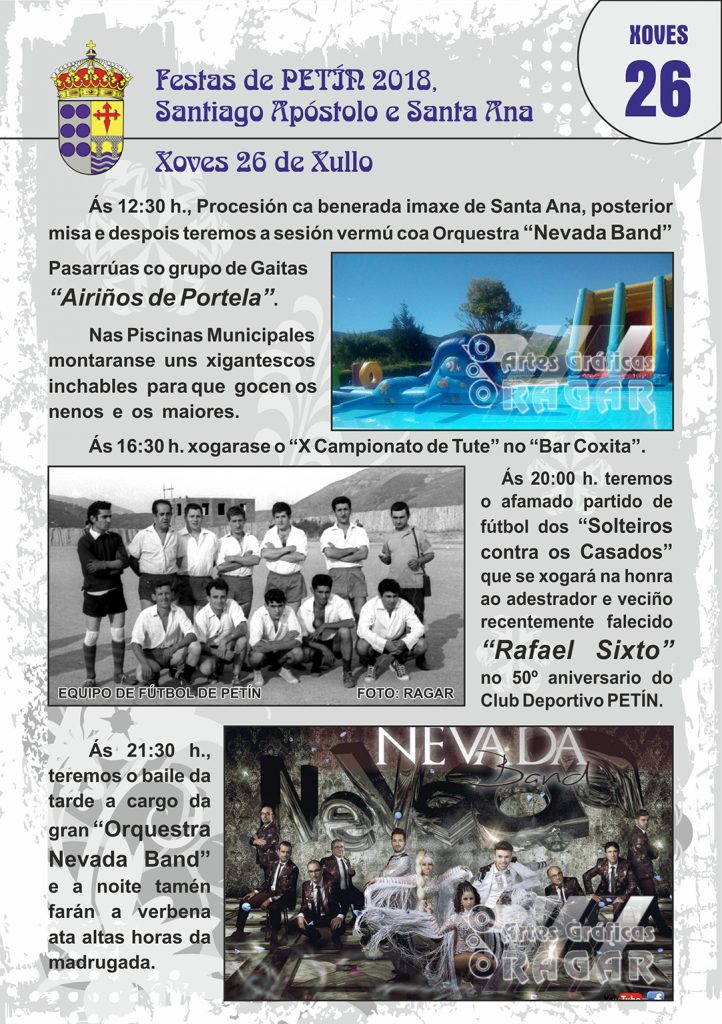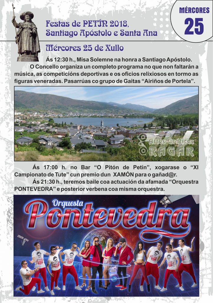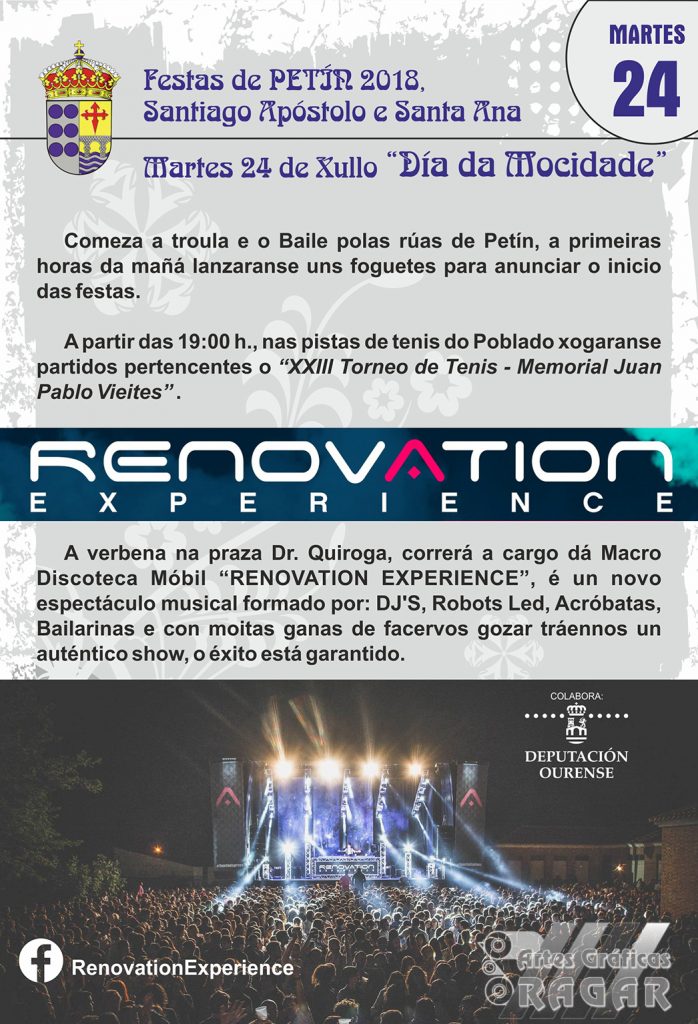 Petín vivirá las fiestas patronales de Santiago Apóstol y Santa Ana desde el 24 al 28 de julio. El martes 24 de julio será el día de la juventud con “Renovation experience”, una “marcro disco-show” que contará con DJs, bailarines y acróbatas.