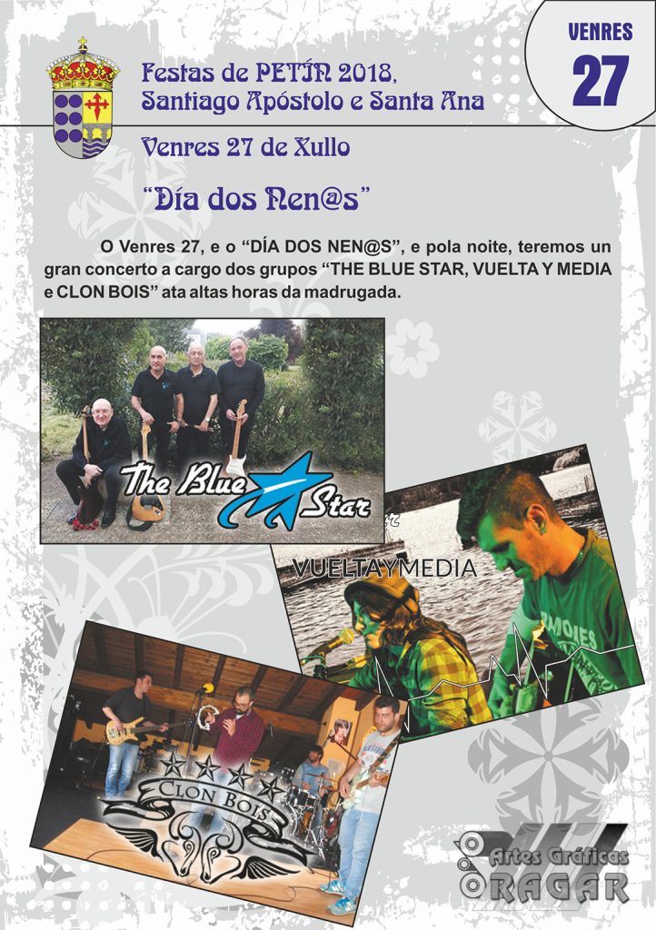 El viernes 27 de julio habrá un concierto de pop rock con los grupos “The blue star”, “Clon bois” y “Vuelta y media”. Y el sábado, 28 de julio actuará el Grupo Podium.