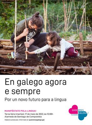 - A plataforma cidadá, composta por máis de 500 entidades sociais e culturais do país, convoca á sociedade a manifestarse o 17 de maio ás 12h en Compostela baixo o lema “En galego agora e sempre. Por un novo futuro para a lingua”