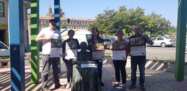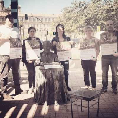 - Representantes da plataforma cidadá Queremos Galego nas Terras de Lemos, Chantada e Quiroga animan a participar na manifestación pola lingua amosando o cartel onde a escultura de Manuel María en Monforte de Lemos.