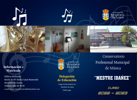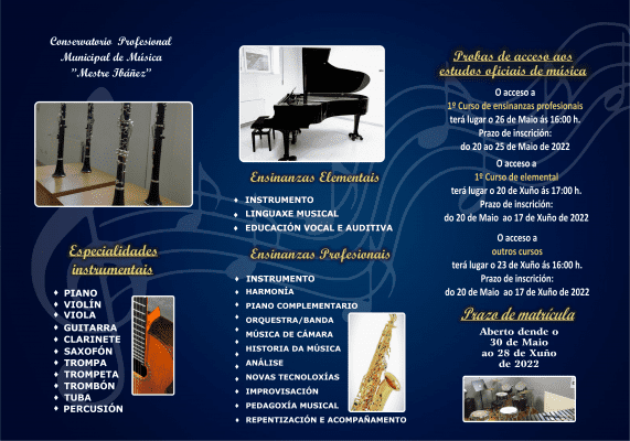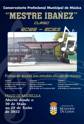 O prazo de inscrición para o acceso ó Conservatorio Municipal de Monforte “Mestre Ibáñez” para o curso académico 2022/2023, nos distintos cursos e especialidades ofertados, quedou aberto dende onte 20 de maio.