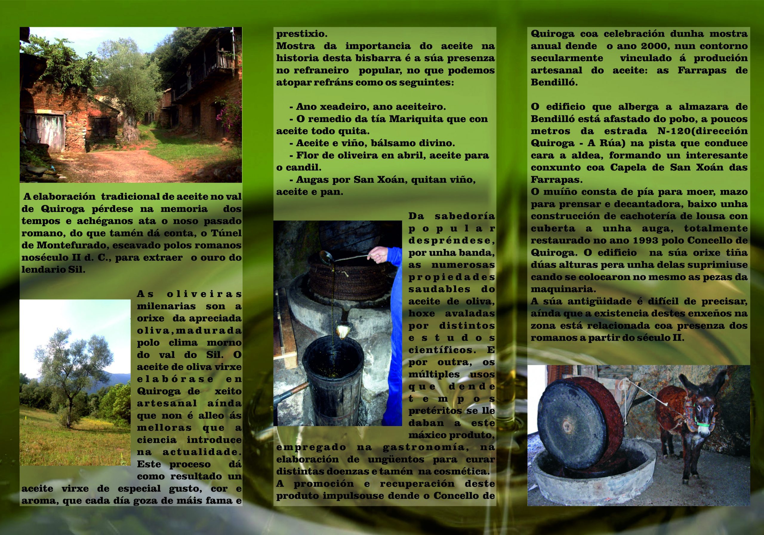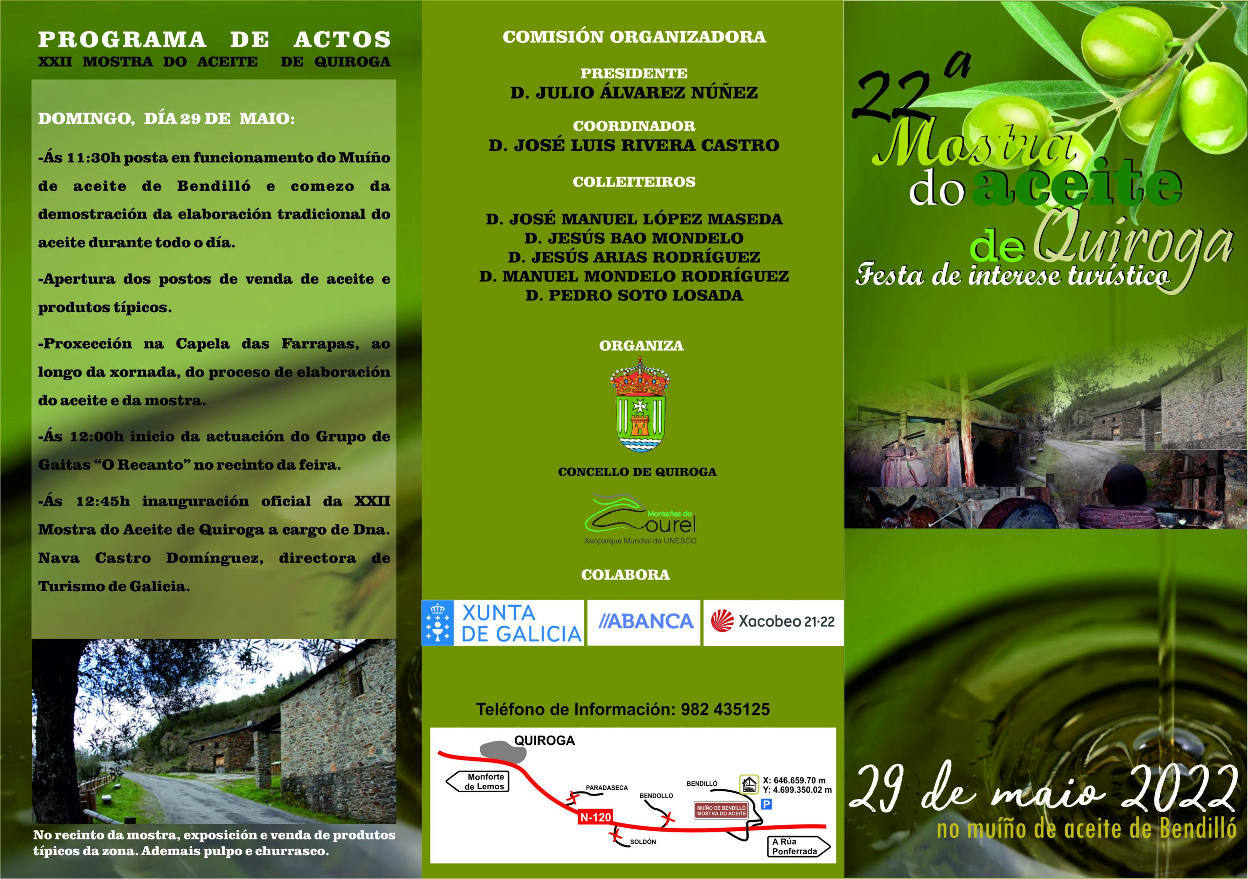 Pechado o programa de actos para a XII Mostra do Aceite de Quiroga que se celebrará o 29 de maio no lugar das Farrapas, en Bendilló. Esta festa que conta dende o ano 2014 co distintivo de Festa de Interese Turístico de Galicia, será como sempre unha mostra máis etnográfica que festiva, onde a moenda tradicional do aceite dentro do muíño terá especial protagonismo.