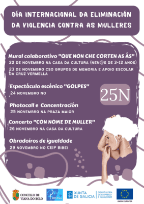 - Conmemoración “25 de novembro”: Durante a mañá do 25 de novembro terá lugar unha concentración na Praza Maior e lectura dun manifesto contra a violencia machista. Ademais, o CIM instalará unha mesa informativa e photocall para concienciar á veciñanza contra a violencia machista.