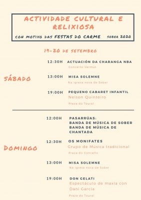 Haberá misa solemne os dous días, 19 e 20, na Igrexa Nova, música e dous espectáculos familiares, os dous na Praza do Toural. O domingo haberá pasarrúas coa Banda de Música de Sober e a de Chantada.