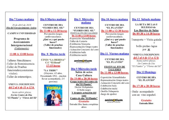 Para la actividad de La Ruta de las 5 iglesias y la Universidad es necesario inscribirse los días del 2 al 4 de mayo 11:00 A 12:00 horas en conserjería de los Centros de Día “El Plantío” y “Flores del Sil”. Hasta cubrir plazas.