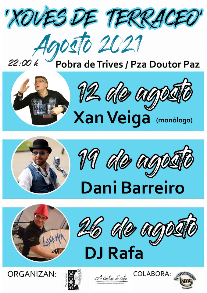 Polo escenario da Rúa Doutor Paz pasarán estes días o humorista Xan Veiga (día 12), o músico Dani Barreiro (día 19) e o DJ Rafa (día 26). Humor, música e guateque para completar un mes de agosto que disque chegará, por fin o verán… incluso en Trives.