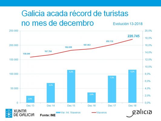 Galicia consiguió en diciembre la mayor cifra de turistas de su historia, con más de 220.000 viajeros alojados en sus establecimientos hoteleros, lo que supone un 9,2% más que en el mismo mes del año anterior. Así se desprende de los datos difundidos hoy por el Instituto Nacional de Estadística (INE), que muestran el intenso avance de la estrategia de desestacionalización de la demanda turística fruto de las actuaciones que la Xunta está liderando en colaboración con el sector de la Comunidad.