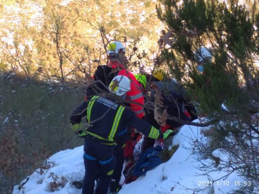 Se produce la llegada casi simultánea de los medios terrestres y el helicóptero, del que descienden dos rescatadores. Se procede a la inmovilización de la víctima y a su rescate con la grúa del helicóptero, aproximadamente a las 16:05 horas, que la traslada a la base de Cueto, donde la espera una ambulancia para su traslado al Hospital del Bierzo.