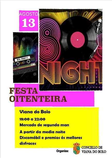 El domingo, 13 de agosto, habrá una Fiesta de los Ochenta y un mercadillo desde las 18,00 horas en adelante, con una disco móvil, disfraces y premios. En este día, y el lunes 14 de agosto, se instalarán hinchables para los niños.