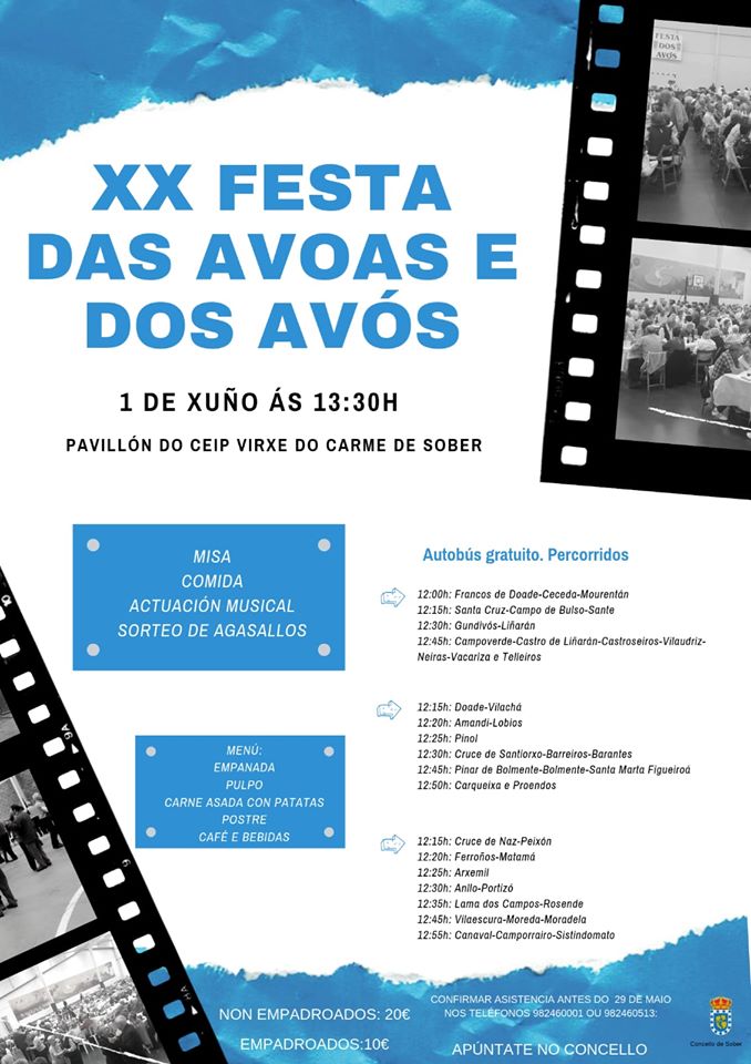 El Ayuntamiento de Sober celebra mañana sábado día 1 de junio a XX Fiesta de las Abuelas y de los Abuelos. La celebración dará comienzo a las 13:30 horas en el pabellón del CEIP Virgen del Carme.