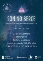 Trátase un concerto sensorial para bebés de 0 a 3 anos titulado “Son no berce”, que correrá a cargo de Cristina Collazo (A Cova das Letras), e que se celebrará o martes 27 decembro, con dúas sesións, ás 17:00 e 17:30 h, no Edificio Multiusos.