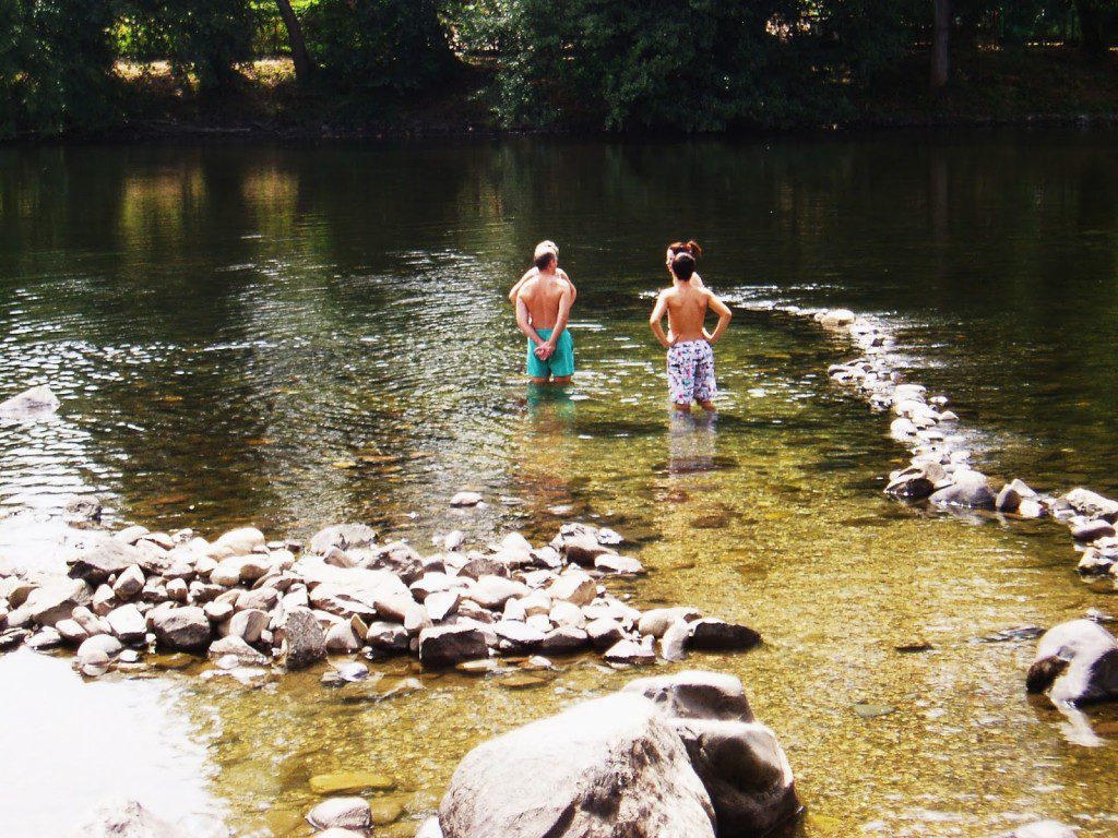 Un turista posibilita el remojo en la playa fluvial de O Barco