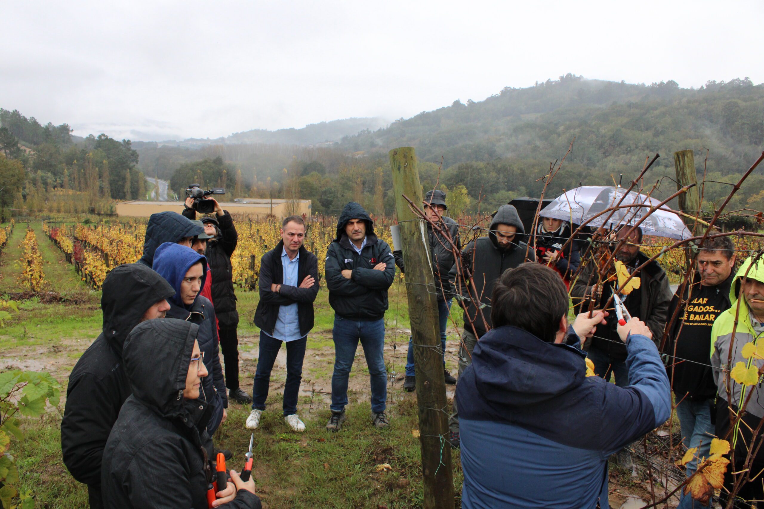 El delegado territorial de la Xunta en Ourense, Gabriel Alén, se desplazó a las instalaciones de la Estación de Viticultura y Enología de Galicia (EVEGA) para estar a un lado de los participantes en un taller práctico sobre poda de la vid, organizado por la propia Estación, dependiente de la Agencia Gallega de la Calidad Alimentaria (Consellería de Medio Rural), en colaboración con la Fundación Juana de Vega.
