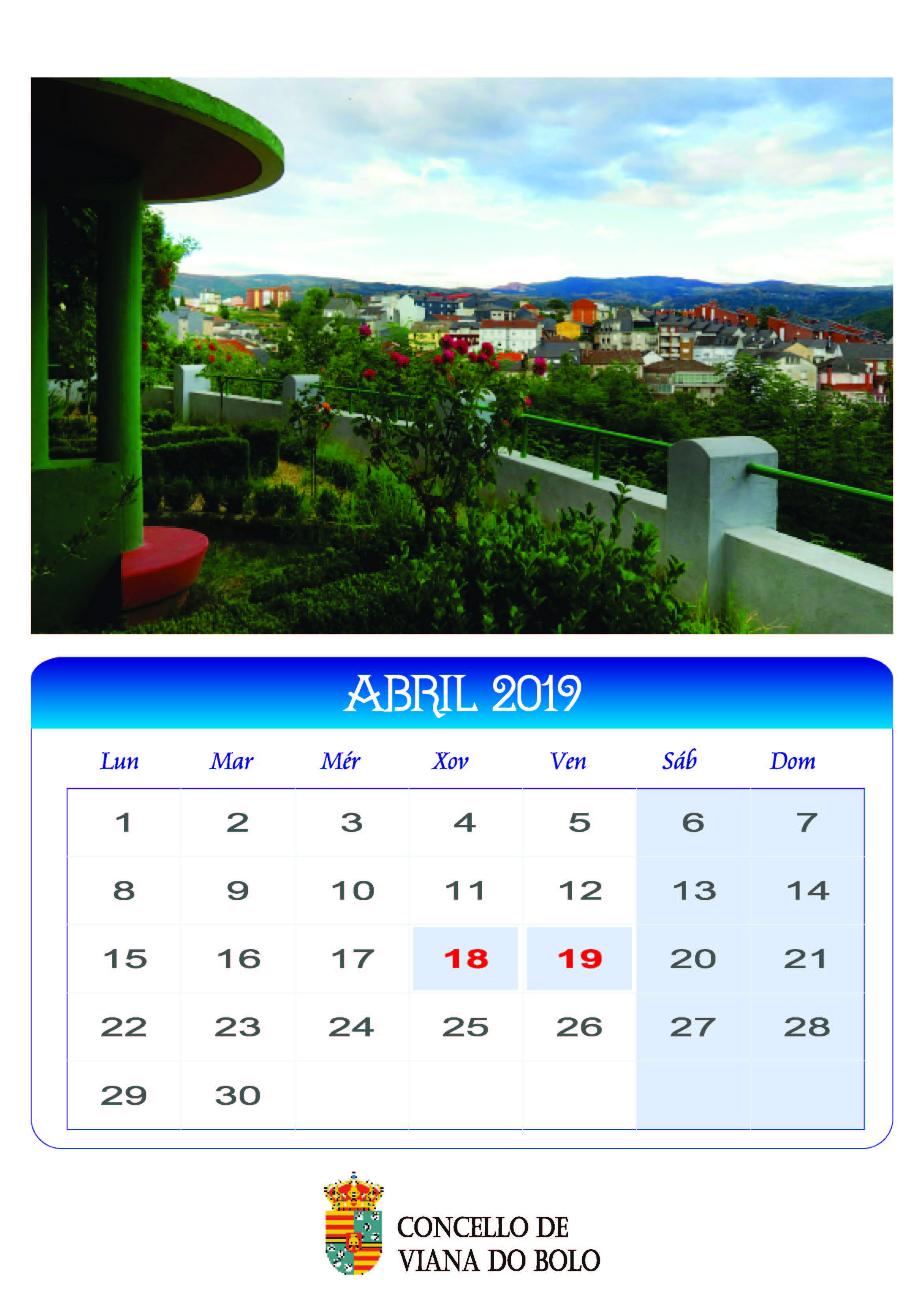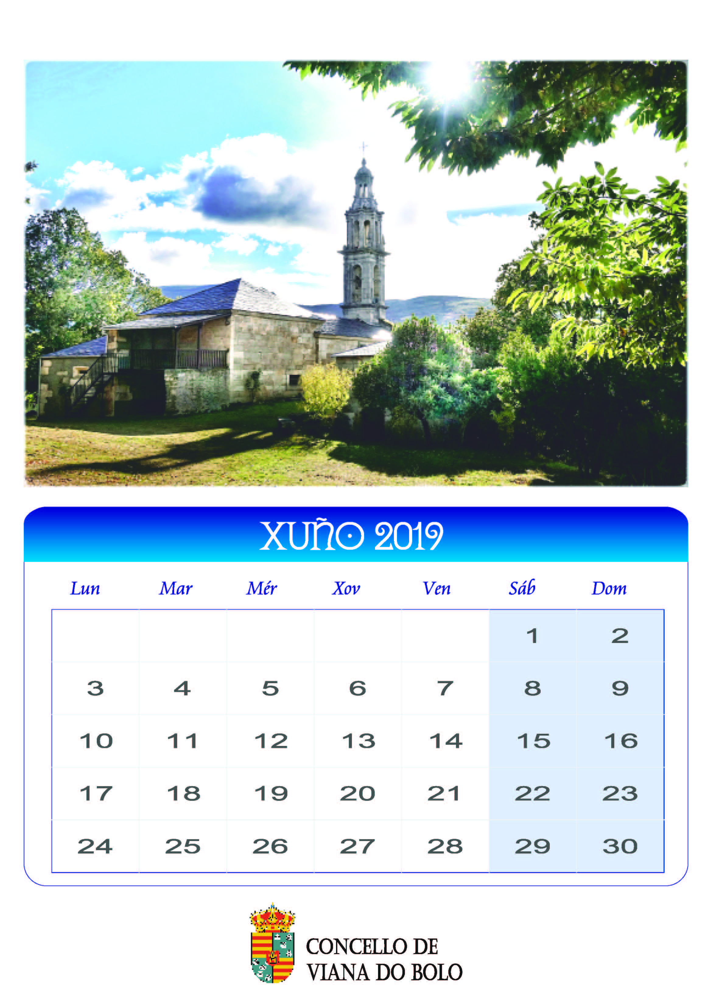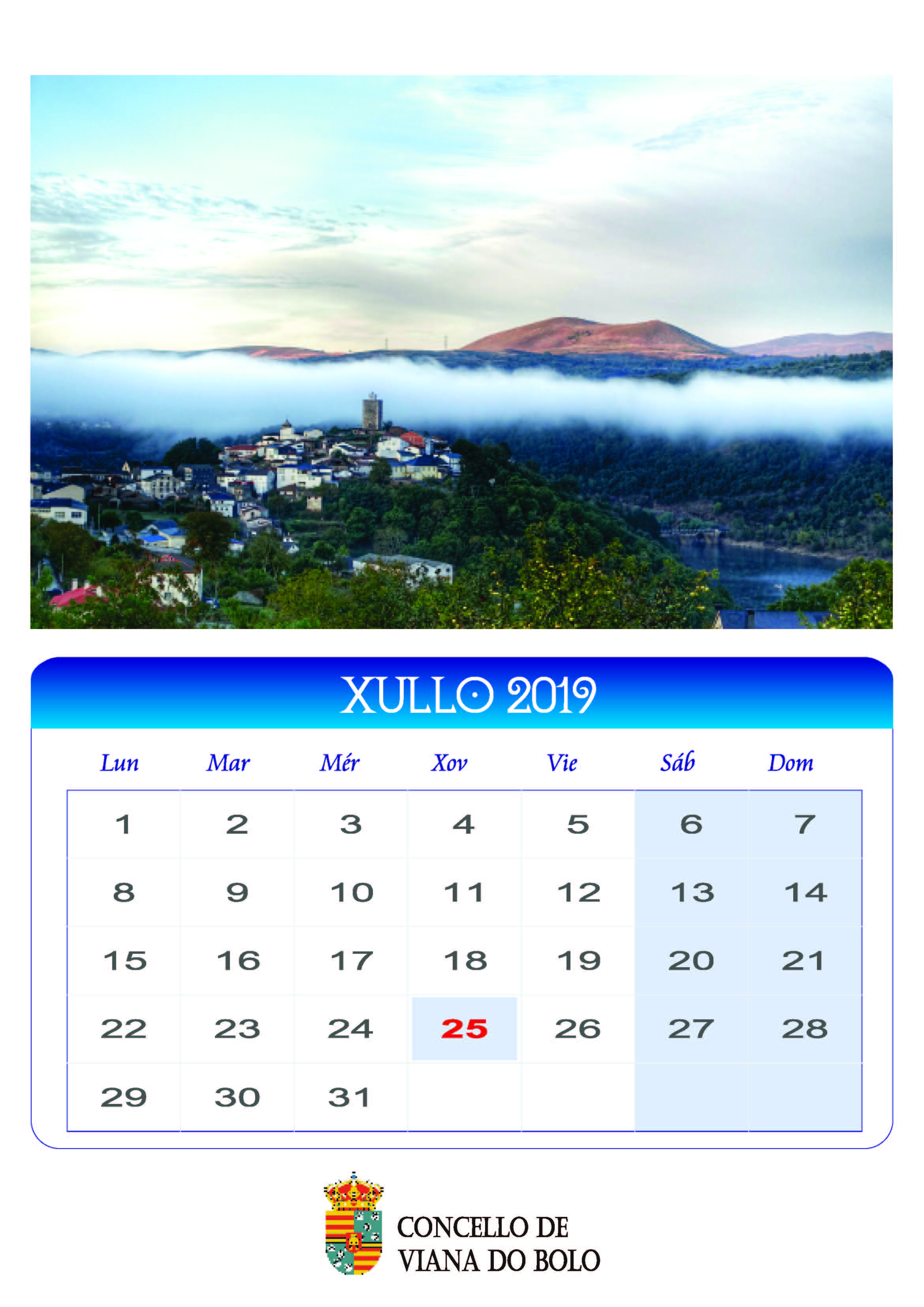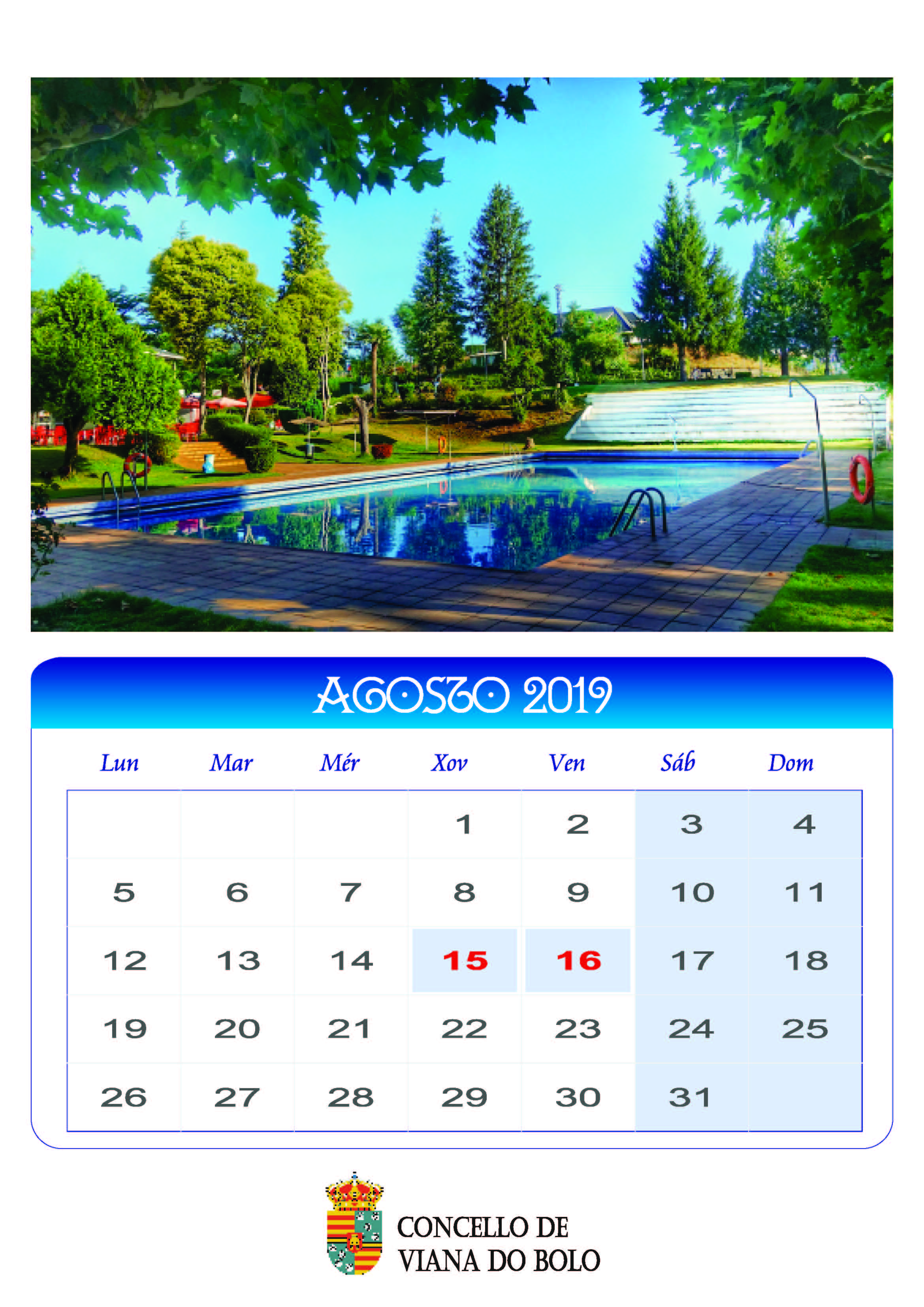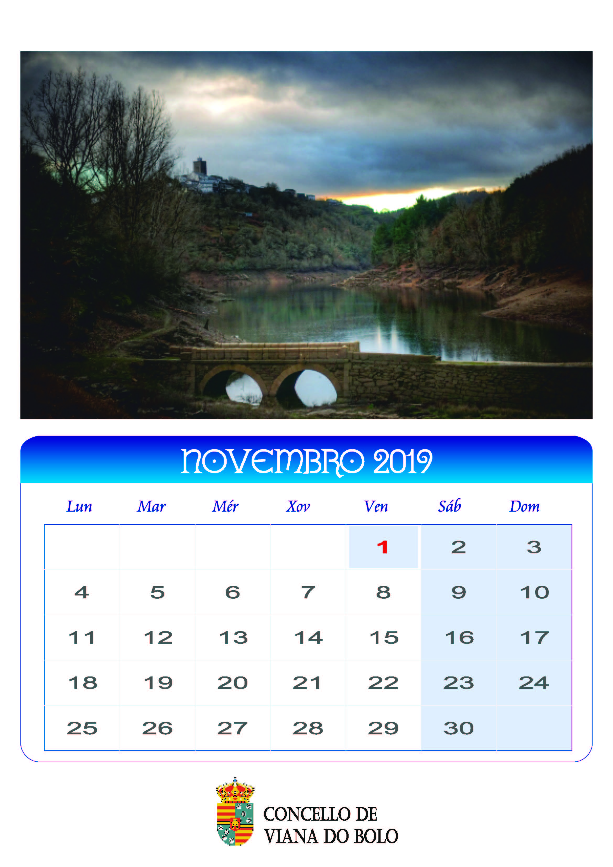 El Ayuntamiento de Viana do Bolo ha editado un calendario que consta de 12 fotografías, una por mes. Dichas fotografías fueron cedidas desinteresadamente por J. Luis Ortiz y Andrés Ortiz a los que el ayuntamiento aprovecha para agradecer este gesto.