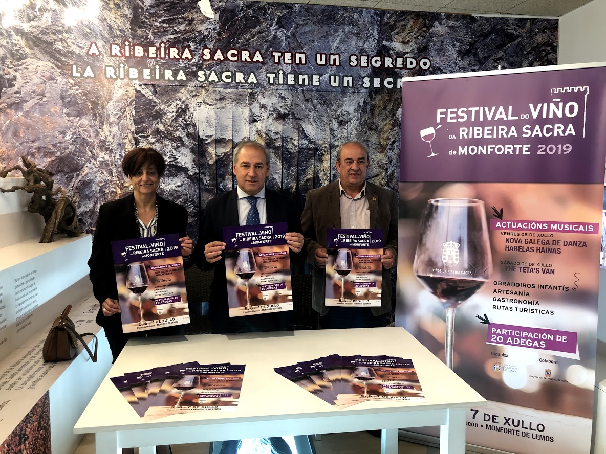 El Alcalde también aclaró que los detalles definitivos del ‘Festival do Viño de la Ribeira Sacra de Monforte 2019’ se darán a conocer con la presentación del programa en los próximos días. Pero, tal y como refleja el cartel, ya se anuncian las actuaciones musicales que habrá en la Plaza de España, tanto el viernes como el sábado, así como los talleres infantiles, la artesanía, la gastronomía, las rutas turísticas y 20 bodegas participantes.