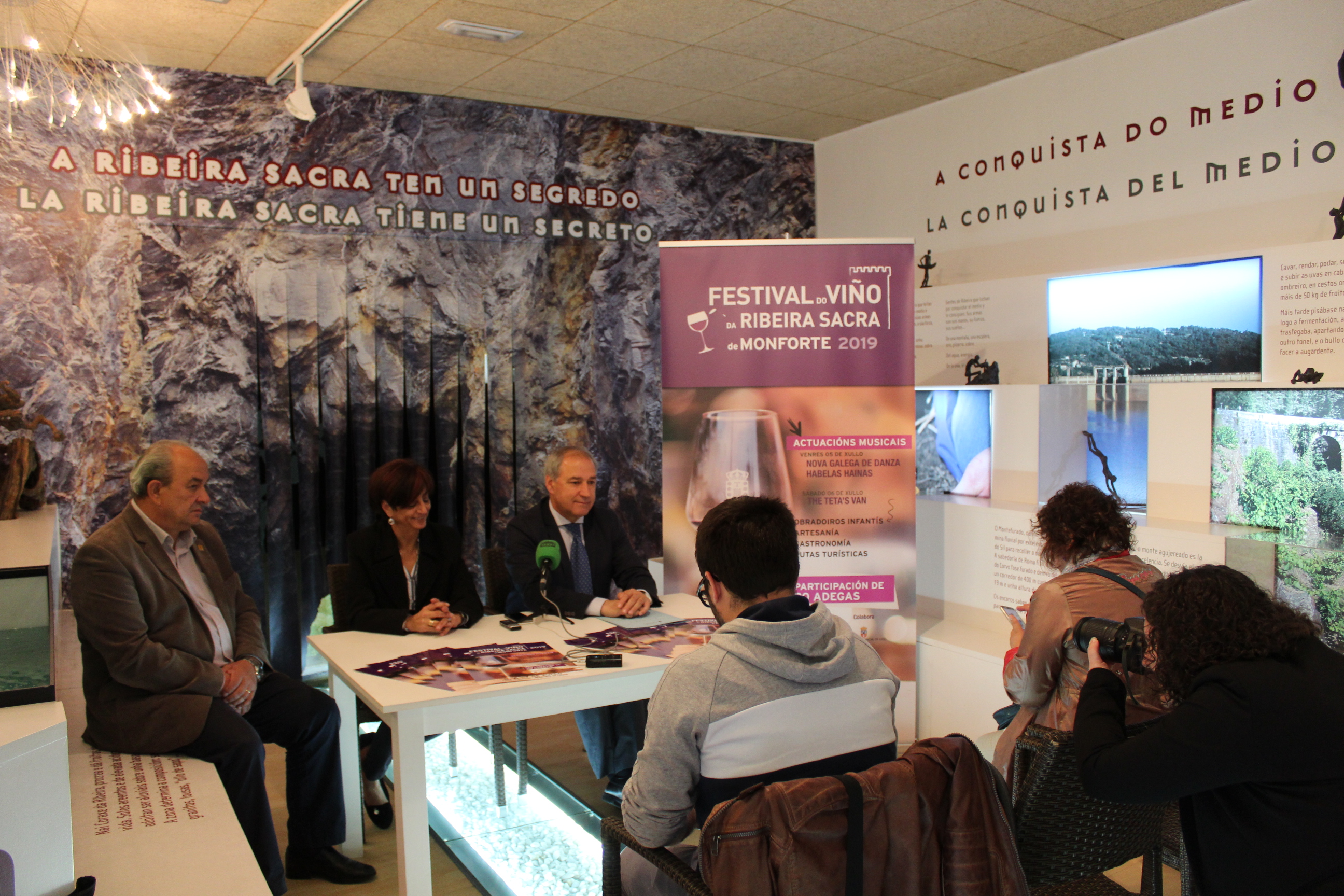 - El Alcalde de Monforte, José Tomé Roca, acompañado por la teniente de alcalde del Ayuntamiento, Gloria Prada, y el concejal de Servicios, José Luis Losada, presentó en el espacio museístico del Centro del Vino el cartel oficial de la tercera edición del ‘Festival do Viño de la Ribeira Sacra de Monforte 2019’