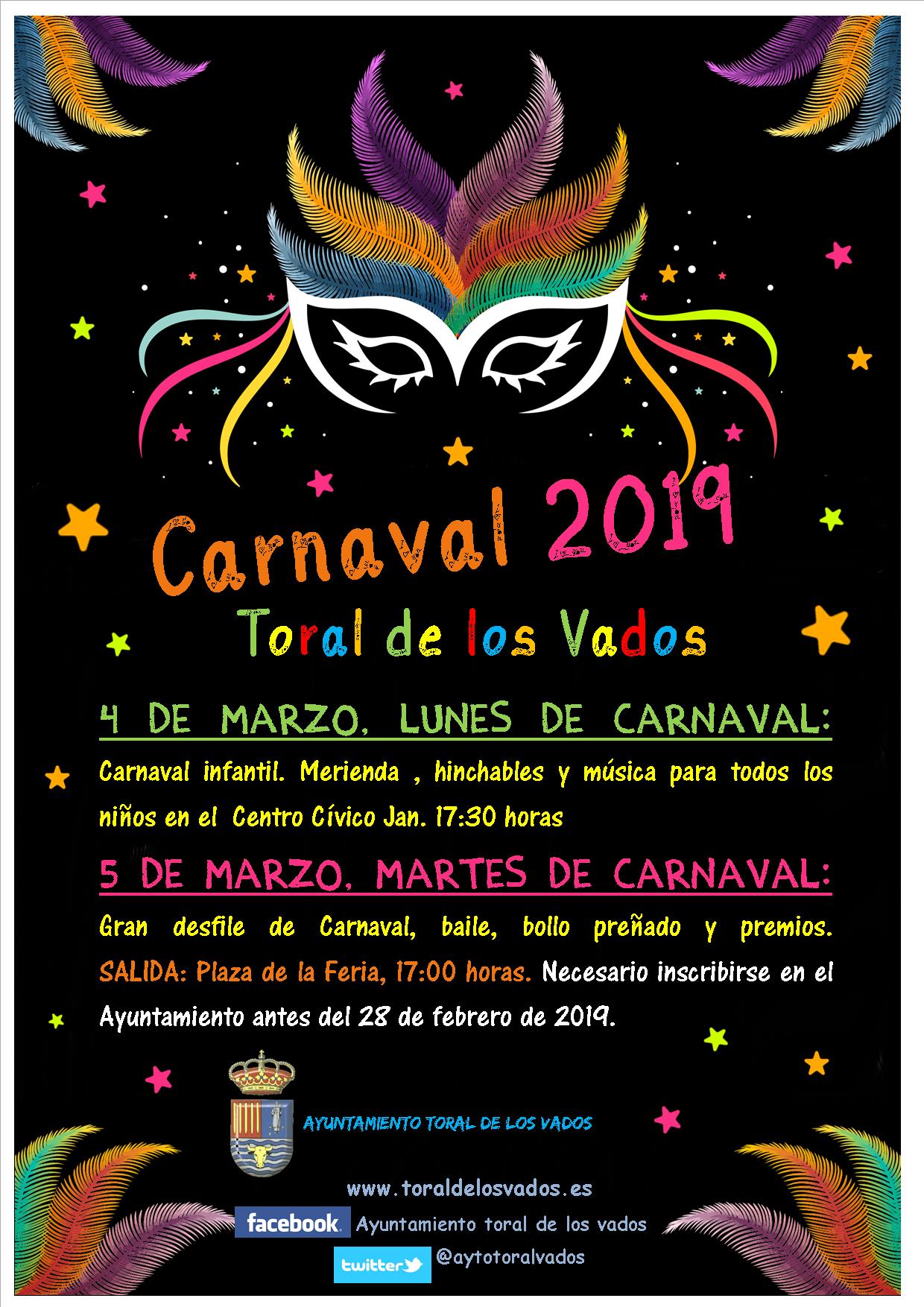 La participación en el desfile de carnaval 2019 supone la aceptación de las bases que establece el Ayuntamiento de Toral de los Vados. Las bases completas pueden ser consultadas en www.toraldelosvados.es.