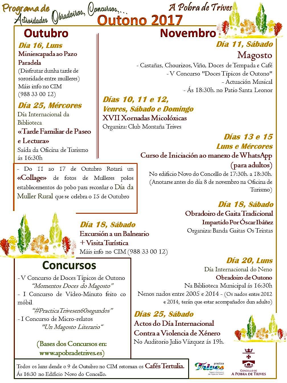 A Pobra de Trives será escenario de varias actividades en los próximos días, dentro del calendario de otoño. Así, mañana sábado, 18 de noviembre de 2017, acogerá un “obradoiro” de gaita tradicional.  Será impartido por Óscar Ibáñez y lo organiza la Banda de Gaitas Os Trintas.