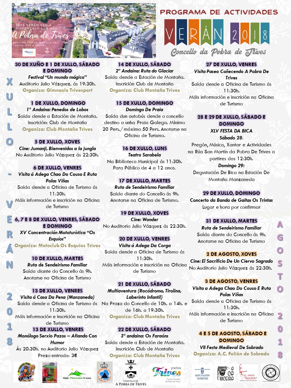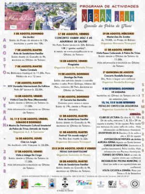 El Ayuntamiento de A Pobra de Trives ha dado a conocer la programación del verano para los meses de julio y agosto. Se trata de un amplio abanico de actividades para brindar a vecinos y vecinas, además de visitantes, una época estival, entretenida, divertida y para todos los públicos.