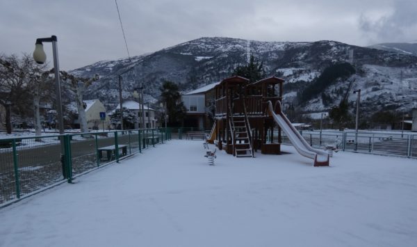Parque infantil del Campo de San Roque envuelto en nieve, en A Rúa