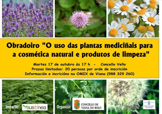 El Concello de Viana ha organizado para hoy martes, 17 de octubre de 2017, un taller sobre “El uso de plantas medicinales para la cosmética natural y productos de limpieza”. Será en las dependencias del Ayuntamiento viejo, a partir de las 17,00 horas.