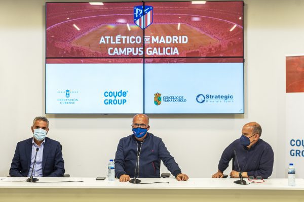 El presidente de la Deputación de Ourense, Manuel Baltar, junto al ex futbolista del Atlético de Madrid y director deportivo de los campus, Manuel Sánchez, “Manolo”, y el alcalde de Viana do Bolo, Abelardo Carballo, presentaron las actividades del Campus de verano del Atlético de Madrid, que se desarrollará en el concello vianés del 2 al 7 de agosto, dirigido a niños y jóvenes de entre 5 y 16 años.