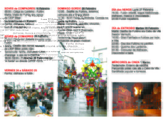 El martes 28 de febrero, por la mañana será el turno para un desfile de foliones hasta Cabo de Vila. A las 16,00 horas será el momento de la “batalla” de harina. A las 22,00 habrá una cena de foliones y, a las 12 de la noche, serán quemados los “lardeiros”. Media hora después, habrá un concurso de disfraces, música y bailes.