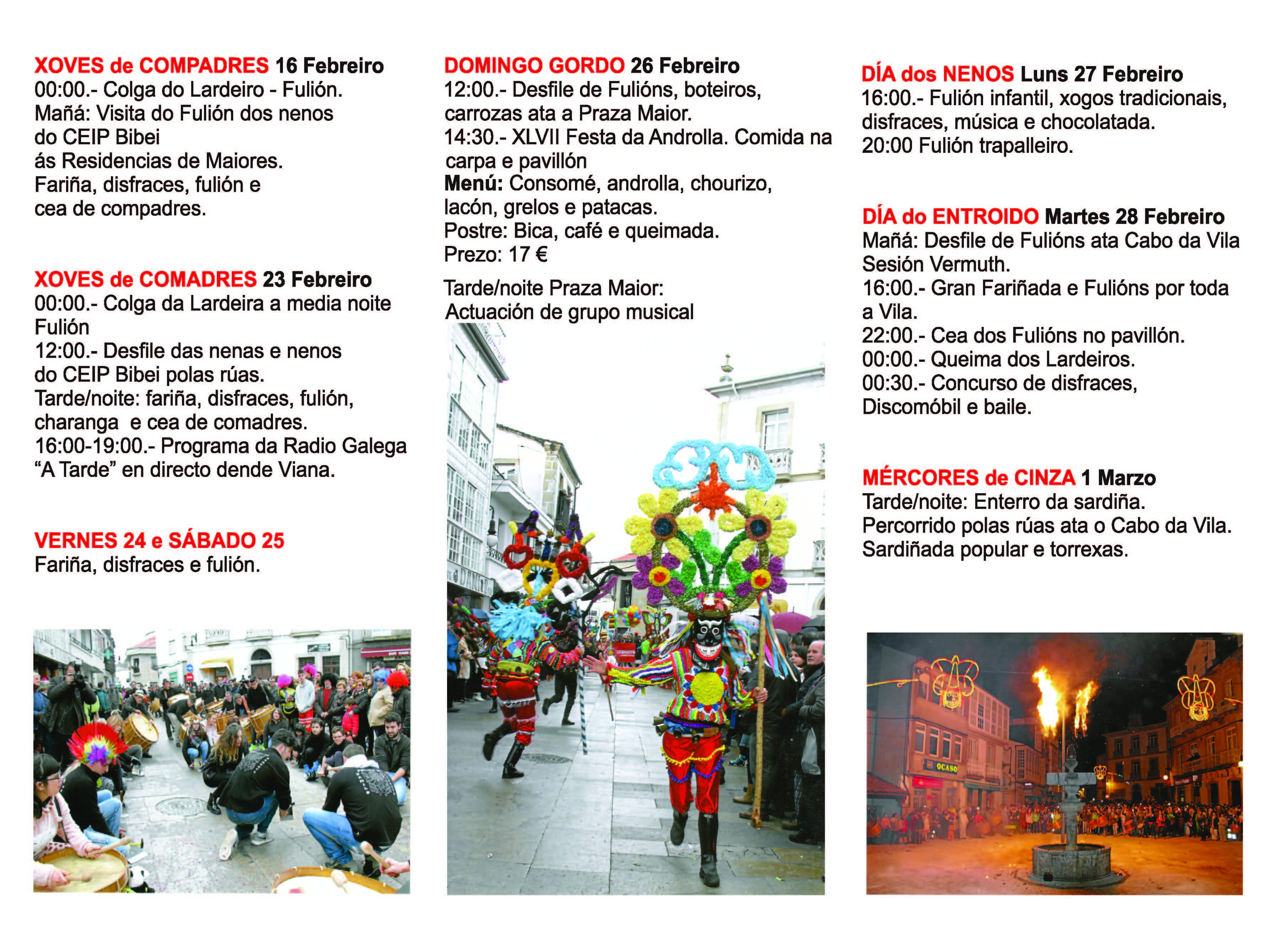 El lunes 27 de febrero es el día dedicado a los niños. Por ello, a partir de las 16,00 horas, tendrá lugar un folión infantil, juegos tradicionales, música y una “chocolatada”. A las 20,00 horas habrá un “folión trapalleiro”.