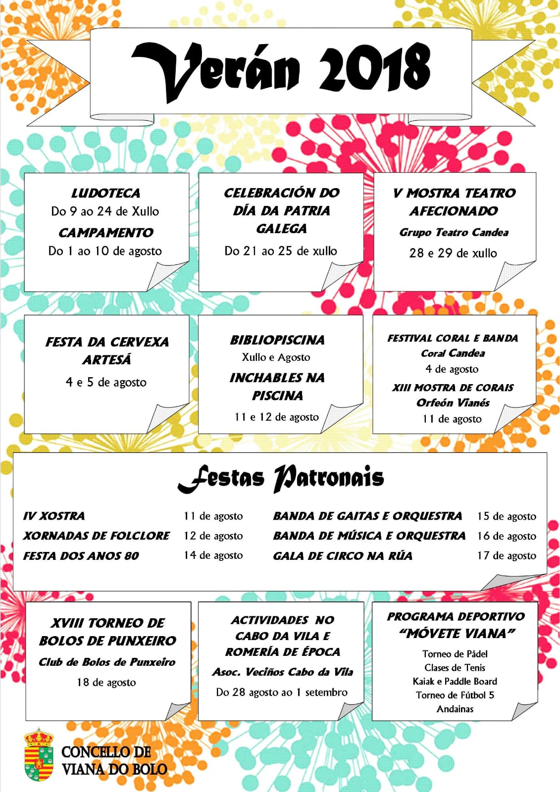 El Ayuntamiento de Viana do Bolo ha programado el verano con actividades lúdicas, culturales, festivas y deportivas dirigidas a todos los públicos y para todas las edades. De ellas, sobresale el calendario festivo en torno las fiestas patronales, el festival “Xostra” (11 de agosto) y las Xornadas de Folclore (12 de agosto).