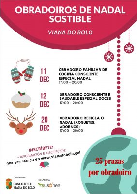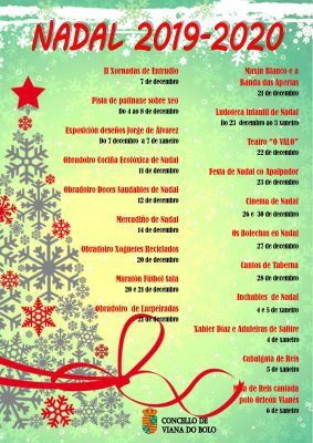 Un año más el ayuntamiento de Viana do Bolo, junto con diversas asociaciones culturales, programa muchas y muy variadas actividades para todos los públicos (ludoteca, teatro, cine, fiestas de navidad, curso de cocina y dulces, música, pista de hielo, etc.), para hacer de esta una Navidad inolvidable.