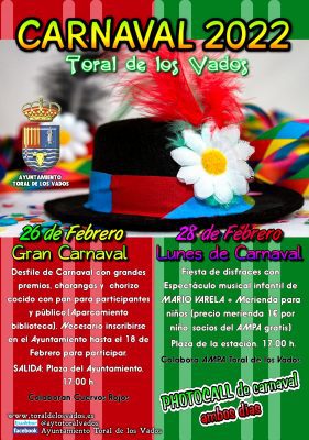 El sábado 26 de febrero darán comienzo las celebraciones del Carnaval 2022 en Toral de los Vados, con nuestro gran CONCURSO DE DISFRACES, en el que habrá un desfile de participantes, charangas, grandes premios, photocall gratuito para hacer las fotos más originales y una gran merienda para disfrazados y público, compuesta por chorizo cocido y pan, que elaborarán los miembros de la asociación motera Cuervos Rojos y que se repartirá en el aparcamiento nuevo de la biblioteca.
