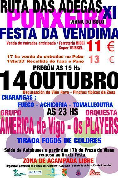 El próximo sábado, 14 de octubre de 2017, Punxeiro, localidad del municipio de Viana, celebra la Fiesta de la Vendimia, organizada por la Comisión de Fiestas de Punxeiro con la colaboración del Centro de Animación de la localidad, con la XI Ruta de las Bodegas.