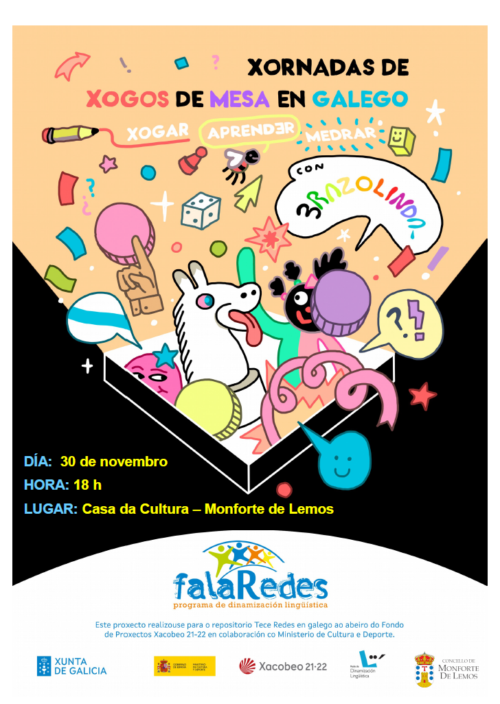 .O Concello de Monforte organiza para hoxe mércores 30 de novembro ás 18:00 horas e na Casa da Cultura Poeta Lois Pereiro a realización dunha sesión de «Xogos de mesa en galego: xogar, aprender, medrar» a cargo de Brazolinda.