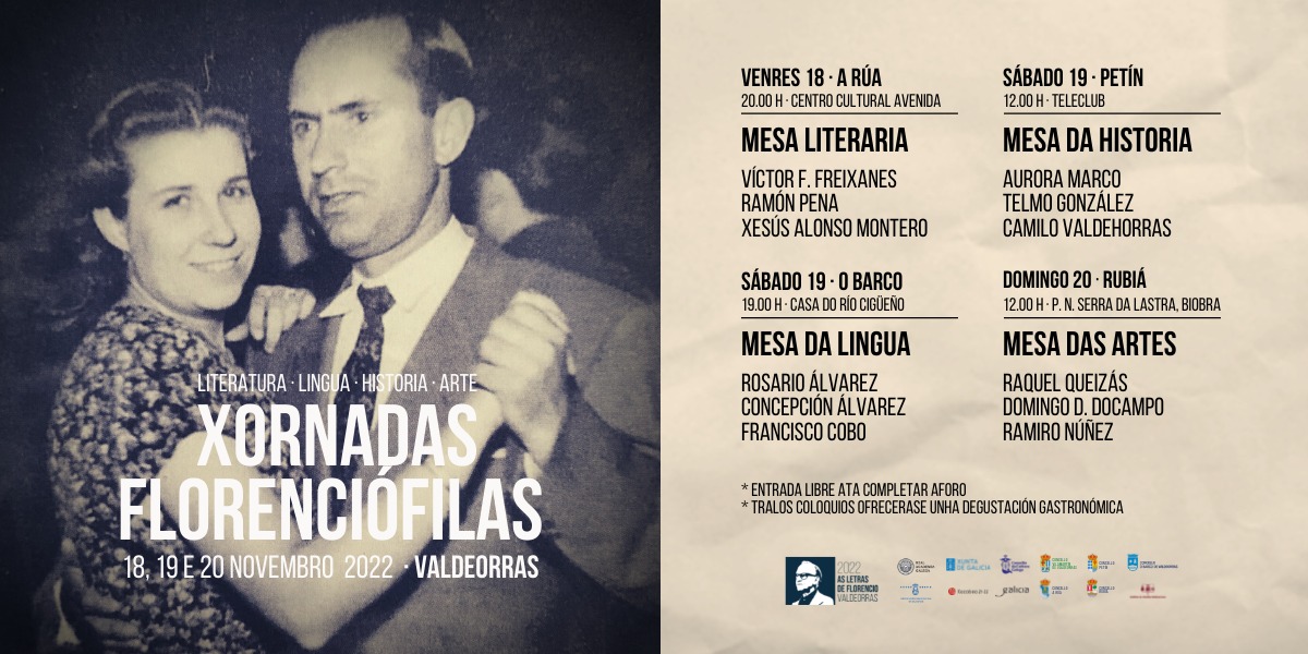 O programa arranca o venres ás 20 horas no Centro Cultural Avenida da Rúa, cunha Mesa Literaria na que estarán o propio Freixanes, Xesús Alonso Montero e mais Ramón Pena, autores os dous últimos de dúas antoloxías sobre Florencio publicadas este ano. O sábado comezará coa Mesa da Historia ás 12 horas no Teleclub de Petín, na que Aurora Marco falará da posguerra e a represión en Valdeorras e Telmo González e Camilo Valdehorras do exilio en México. Ese mesmo día, as sete da tarde, celebrarase un Mesa da Lingua na Casa do Río Cigüeño do Barco. Neste caso intervirán a presidenta do Consello da Cultura Galega, Rosario Álvarez, a lingüísta vianesa Concepción Álvarez, e o investigador barquense Francisco Cobo. As xornadas pecharanse o domingo cunha Mesa das Artes na que estarán creadores que teñen adaptado a Florencio a diferentes formatos e soportes como o tetaro, o audiovisual e a música. Son Domingo D. Docampo, Ramiro Núñez e Raquel Queizás. Para esta última sesión apostouse por rodear o encontro de natureza e farase no Centro de Interpretación do Parque Natural da Serra da Lastra, en Biobra, concello de Rubiá.