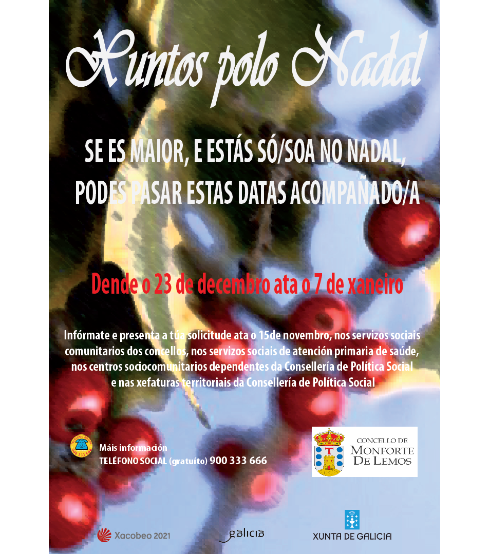 Este programa está destinado a las personas mayores que se encuentren solas en las fechas de Navidad. Oferta 50 plazas en el Complejo Residencial Juvenil Lug II (para las personas solicitantes de la provincia de Lugo) para pasar una estancia de 16 días, de 23 de diciembre a 7 de enero , en régimen de pensión completa y donde se organizarán diversas actividades de animación sociocultural. Las personas de Monforte interesadas en participar deberán acudir a los Servicios Sociales del Ayuntamiento para solicitar plaza antes de 15 de noviembre .