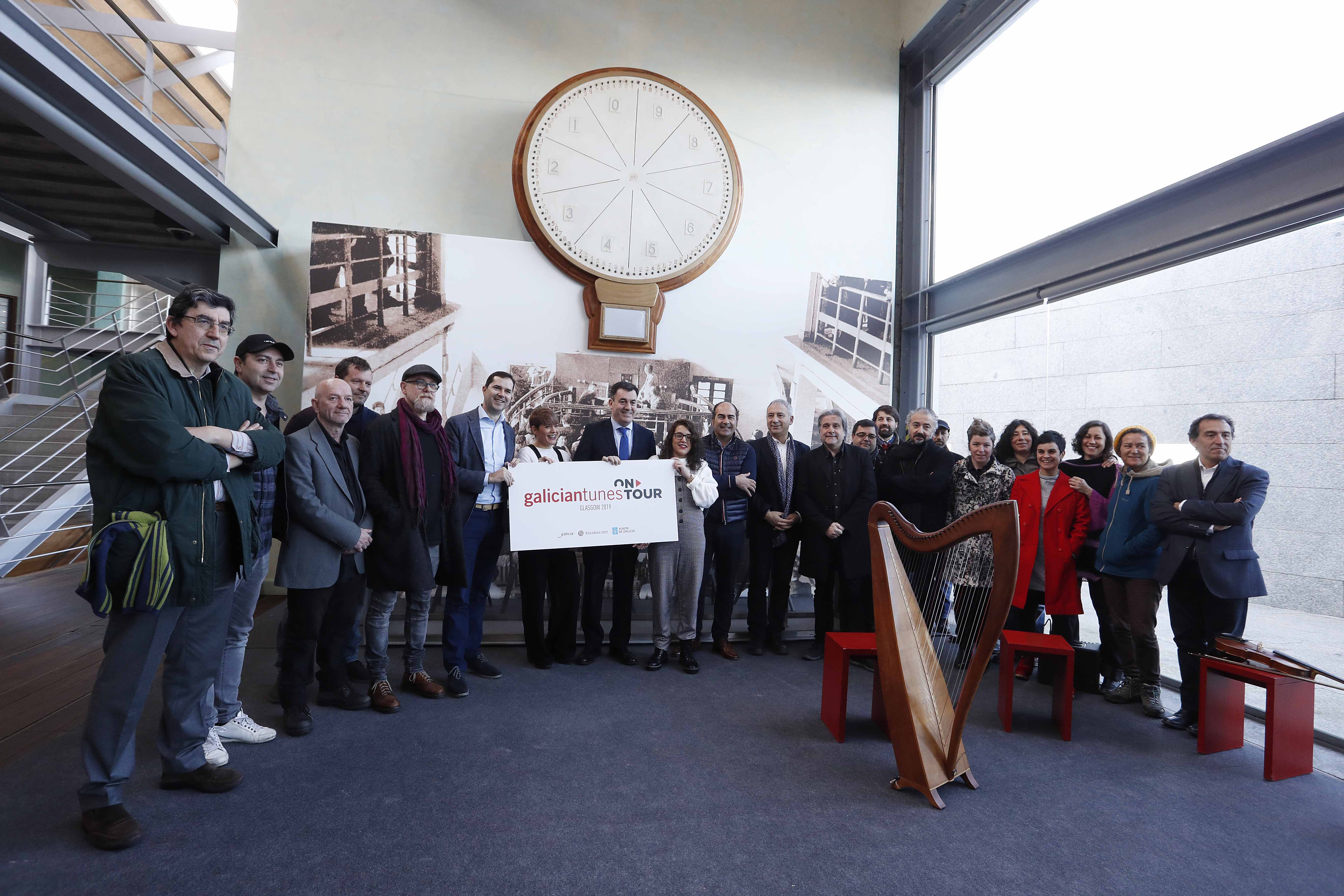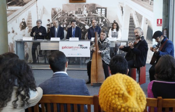 El director de la Agadic, Jacobo Sutil; el delegado territorial de la Xunta en Vigo, Ignacio López-Chaves; y una representación de los artistas que tocarán en Glasgow asistieron también la este acto, para el cual se contó con la música en directo de un trío de arpa, bouzouki y violín, integrado por músicos de Sondeseu.
